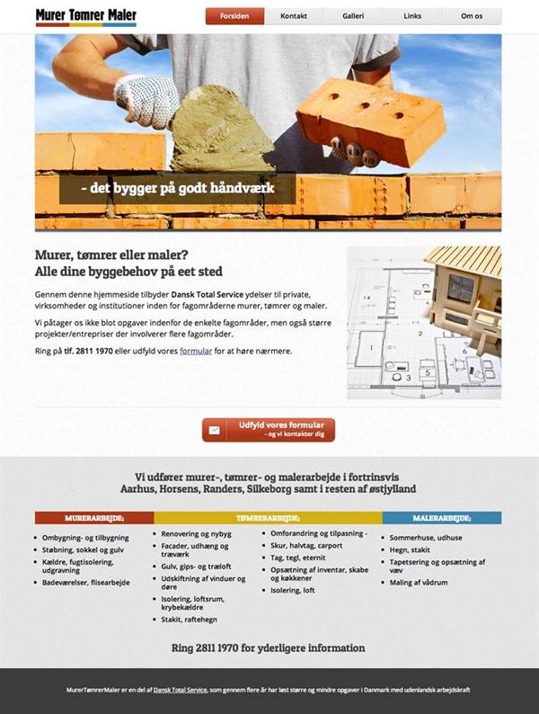 Murer Tømrer Maler Hjemmeside i Umbraco CMS, samt design og logo for Dansk Totalservices Murer Tømrer Maler